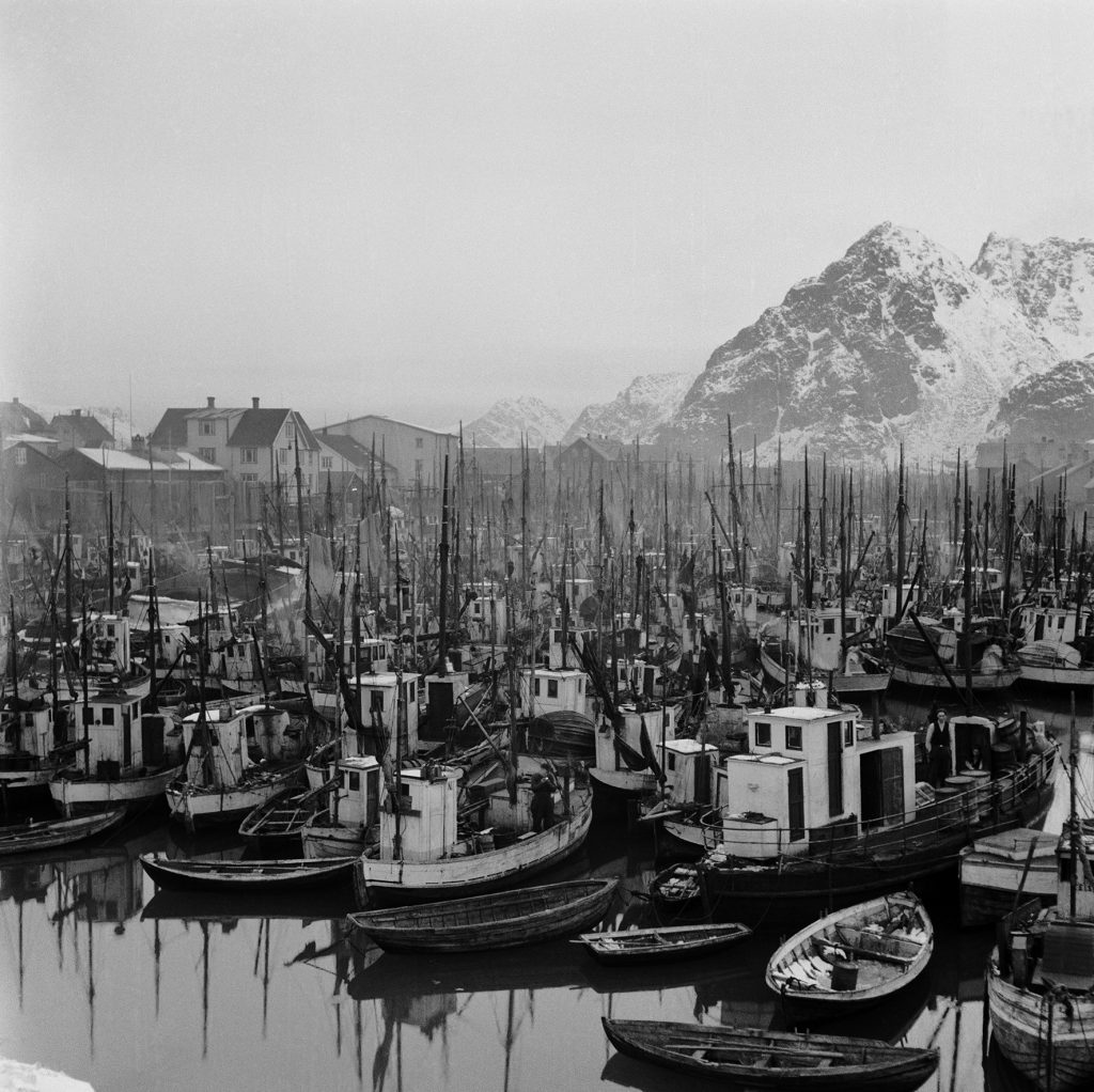 Här ligger ju nämligen världens största fiskeflotta, uppåt 6,000 – 8,000 fiskebåtar, och lilla Svolvaer med sina normalt 3,000 invånare växer till en riktigt stor stad med 15,000 människor under denna tid då båtmasterna nere i hamnen blir till en hel skog. Så mycket vet man redan om torsken, att den om sommaren håller till i Barentshavet utanför Sibirien, bankarna vid Björnön och Svalbard samt vid Novaja Semlja och Murmanskkusten, men sedan vandrar upp till bankarna vid Lofoten för att där kläcka sin rom. En vandring ungefär lika lång som sträckan Italien – Norge.”